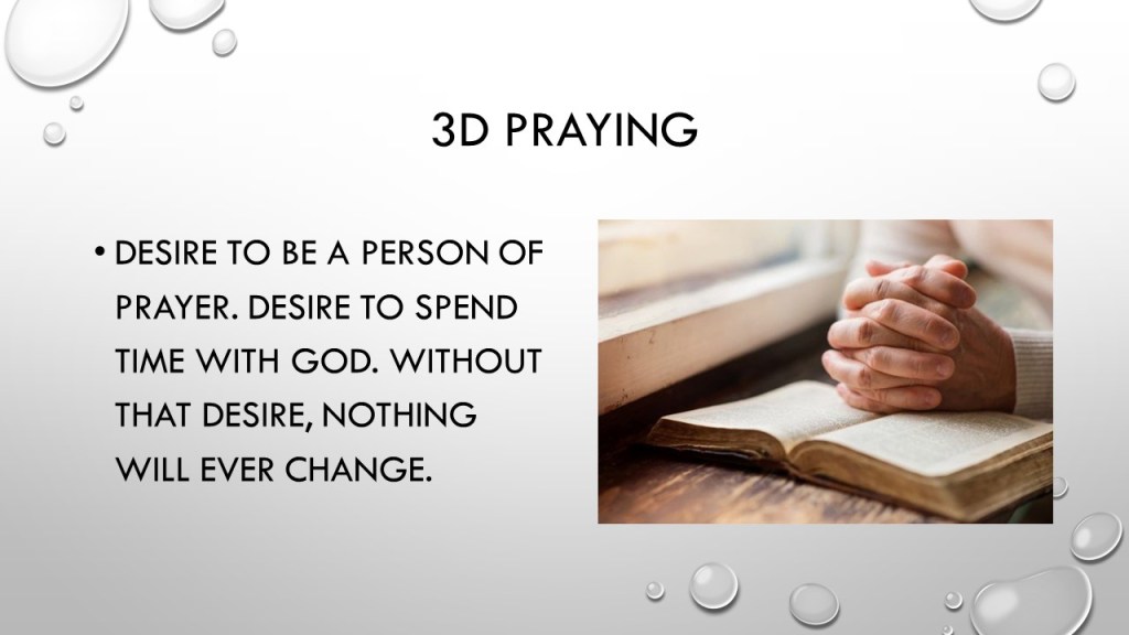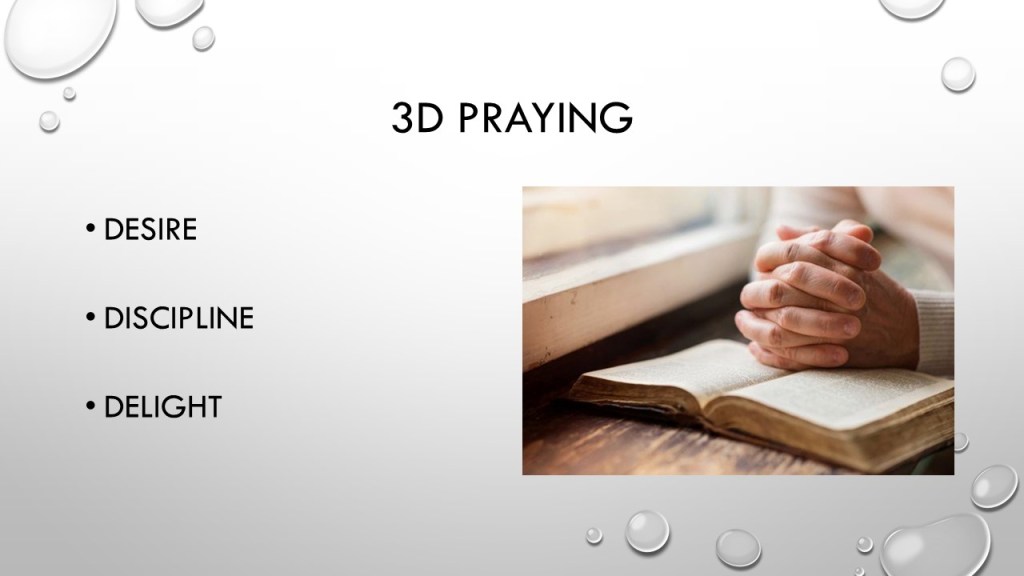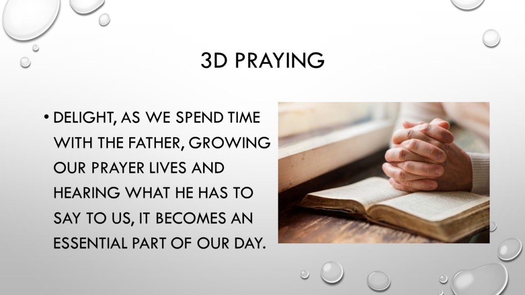 A useful technique we talked about to inspire our prayer time was the 3D approach. Click on each image to walk through the concept.